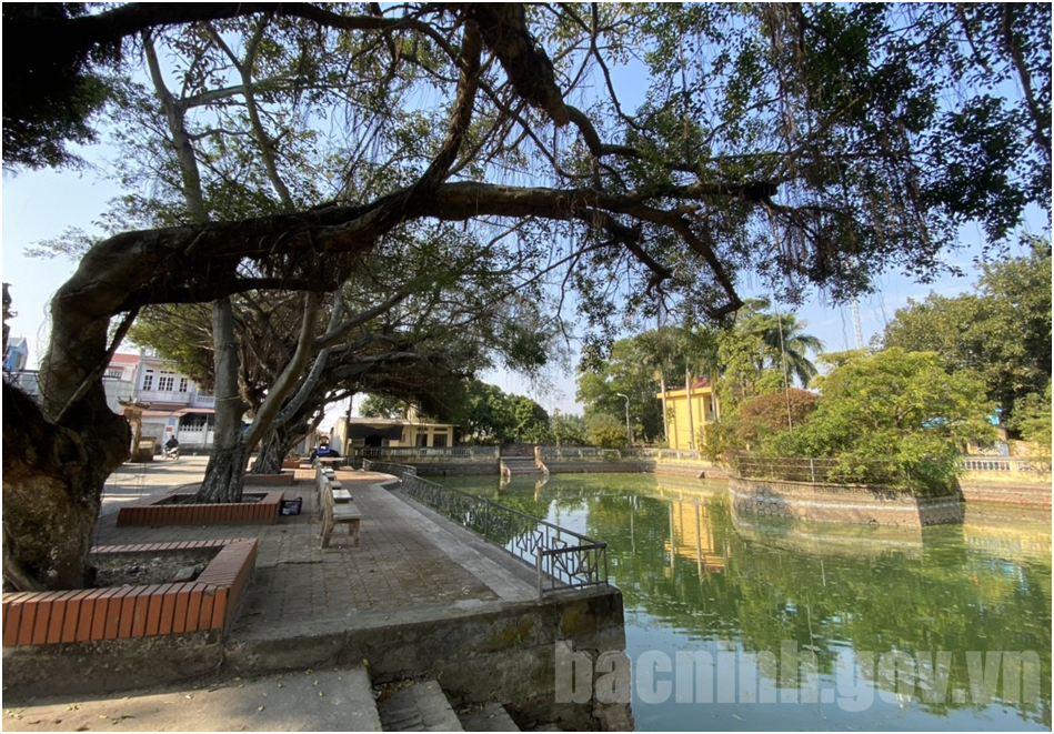 Trước đình là hồ nước trong xanh tạo không gian thoáng mát, trong lành.